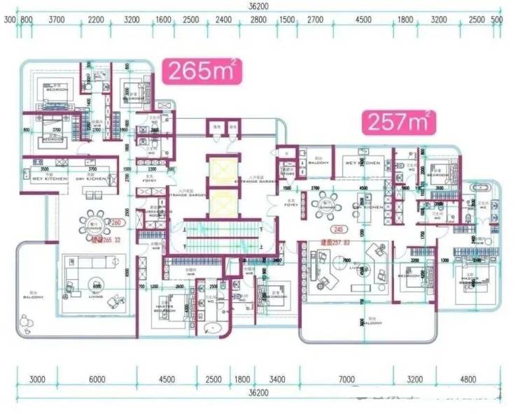 253–332㎡家族平层:2T2板楼设计,独立入户,双主卧套房均带海景卫浴,视野无遮挡,定位为顶奢客群。