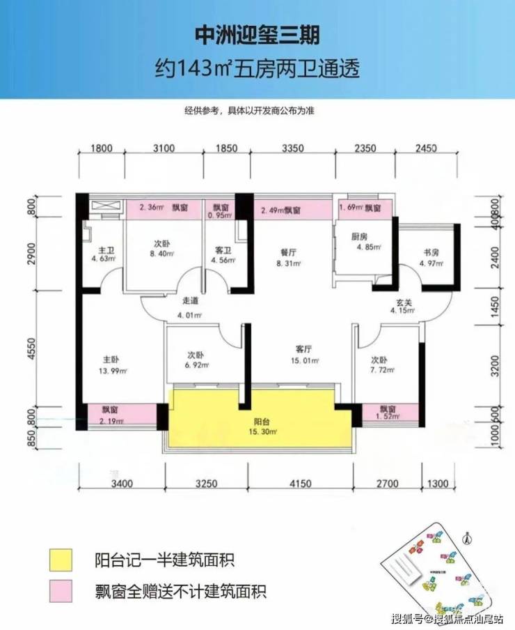 143㎡的5房2厅2卫,设计的是竖厅南北通透格局,进门入户玄关,客厅4.15米开间,LDKB一体化设计,四开间朝南,5个卧室分别做到了主卧16.18㎡/次卧10.76㎡/次卧7.72㎡/次卧6.92㎡/次卧4.97㎡(包含墙体飘窗),客厅连接次卧出7.4米长的大阳台,U型厨房,卫生间干湿分离,赠送面积高达18.85㎡,阳台主朝正南向。