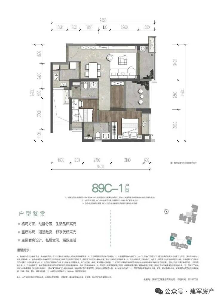 89㎡的3房2厅2卫(二期C-1户型),设计的是经典竖厅格局,客厅3.4米开间约12.92平,LDKB一体化,动静分区,分别做到了主卧12.3㎡/次卧10.36㎡/次卧7.68㎡(包含墙体飘窗),U型厨房,卫生间干湿分离,得房率:72.97%(不含赠送),阳台约5.26平西北或东南朝向。套内面积64.7㎡+赠送面积8.79㎡=实用面积73.49㎡,加上赠送后得房率约82.87%。