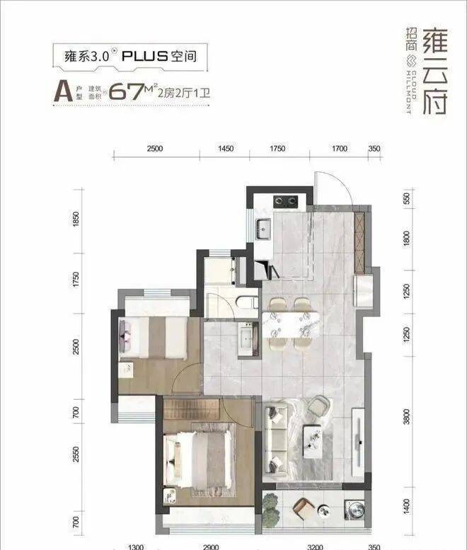 67㎡的2房2厅1卫,设计的是竖厅格局,客餐厅一体化,客厅3.2米开间,S墙设计预留冰箱位,2个卧室分别是2.9/2.5米的宽度,L型厨房,卫生间三段式分离设计,东北朝向。