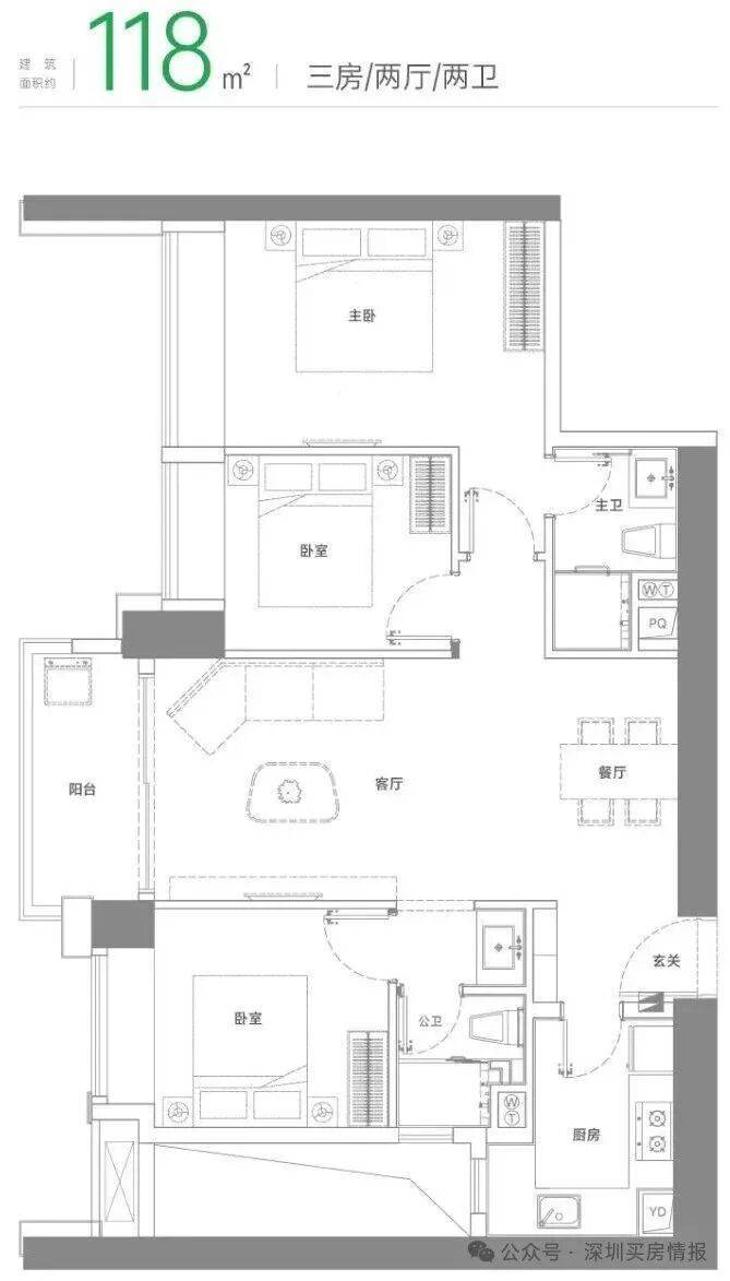 建面约118㎡三房两厅两卫