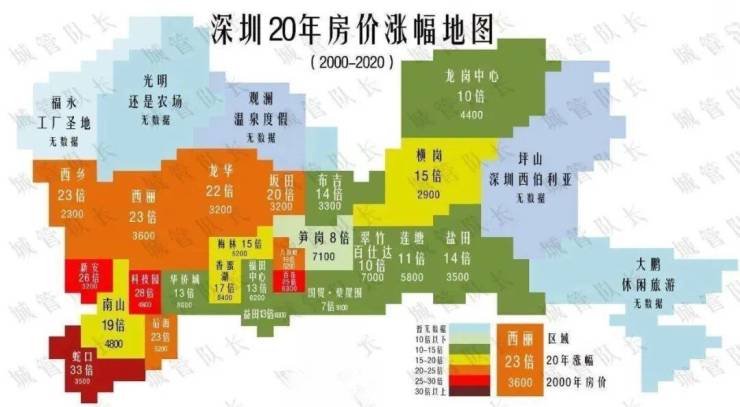 从深圳2000-2020年涨幅地图来看,西丽20年房价上涨近23倍,排名全市第五,仅次于蛇口、科技园、新安、百花。