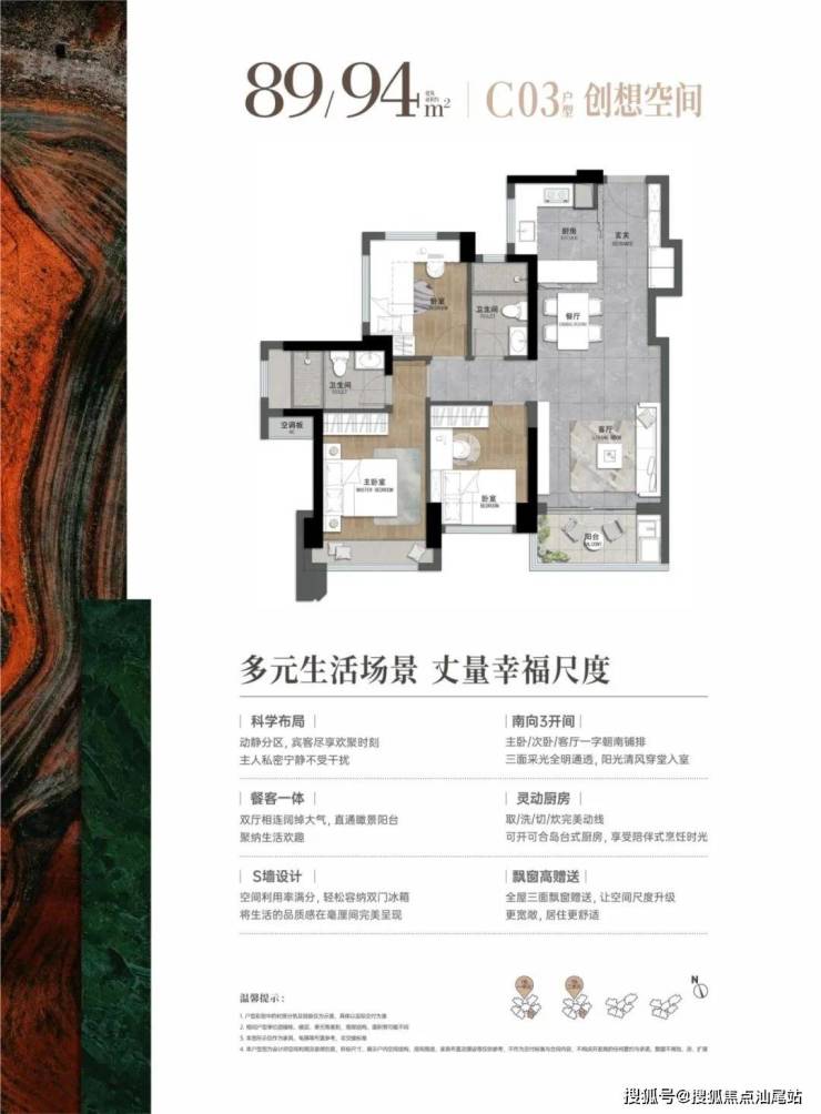 89-94㎡的4房2厅2卫,03,04户型,设计的是经典竖厅格局,进门入户玄关,客厅实测3.245米开间,LDKB一体化,S墙设计预留冰箱卡槽位,三开间朝南,3个卧室分别做到了主卧13.76㎡/次卧8.28㎡/次卧7.74㎡(实测面积,不含墙体),U型灵动式厨房,卫生间干湿分离,得房率约76-81%(不含赠送),东南朝向。