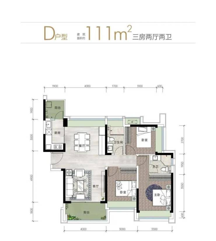 ●110-115㎡3房:双阳台,主卧套间设计,二胎家庭或三代同住无压力,得房率87%-89%(碾压同面积段竞品),不过110平A户型进门就是洗手间,洗手间门口对着餐厅的位置,这个户型需要注意,介意的慎选。
