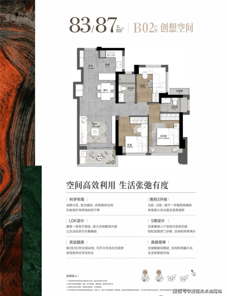 建面约83-113㎡臻装3-4房,户型方正,高使用率,极致空间利用,更能满足精致生活需求。LDKG一体化客餐厅,S墙体冰箱位,多飘窗设计,视野采光更佳,空间实用满分