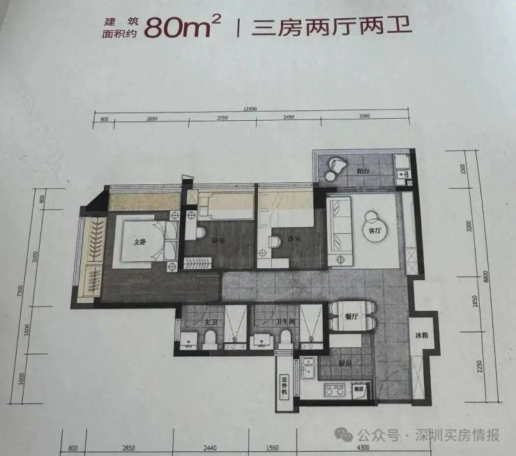 80㎡的3房2厅2卫,设计的是竖厅格局,客厅3.3米开间,LDKB一体化,S墙设计预留冰箱卡槽位,3个卧室分别做到了3.65米/2.55米/2.45米的宽度,L型厨房,卫生间干湿分离,有朝东北向或正东朝向。