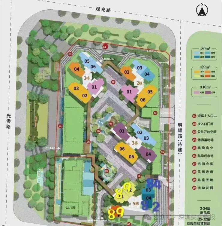 光明区凤凰城板块,中建观玥名邸,总层高32层,2梯6户设计,精装修交付。面积有80-89㎡的3房2厅2卫,107㎡的4房2厅2卫户型,多了一个89㎡横厅3房2卫。项目分栋交付,3/5栋2026年底交付,1/2栋2027年年中交付