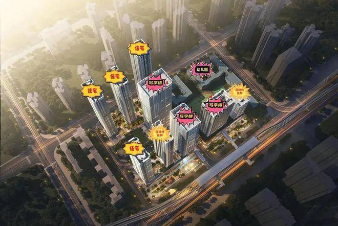 根据公示规划,项目由4栋45F超高层住宅、3栋40F、30F写字楼、1栋45F保障房、1栋3F幼儿园以及一所九年制学校组成,未来将建设成为集住宅、办公商业为一体近40万㎡的TOD城市商住综合体项目。