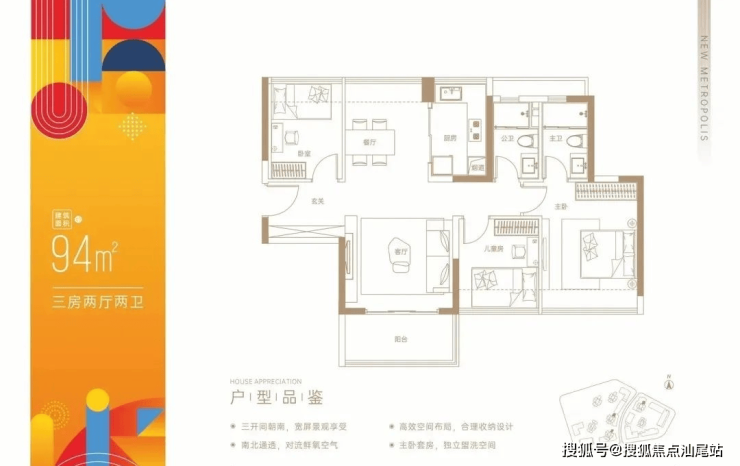 94平:3房2厅2卫,南北通透,使用率77.65%(不包赠送)