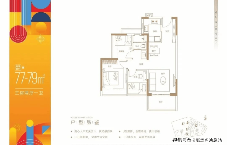 77-79平:3房2厅1卫,西北/西南/东南,使用率77.65%(不包赠送)