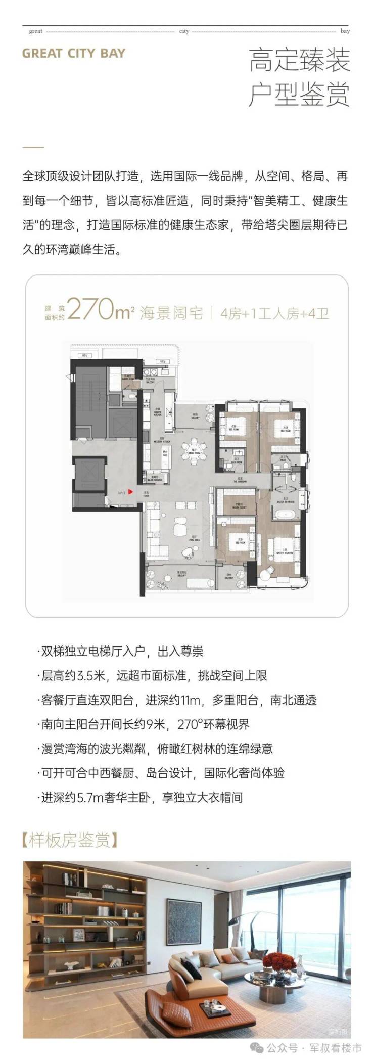 高区面积:270平4房+1工人房+4卫270平复式(13.4万/平起步价)4梯3户(毛坯27楼以上户型)