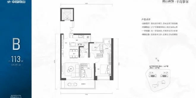 113㎡的3房2厅2卫:位于2-30F,全朝南向,带6.5米宽大阳台。