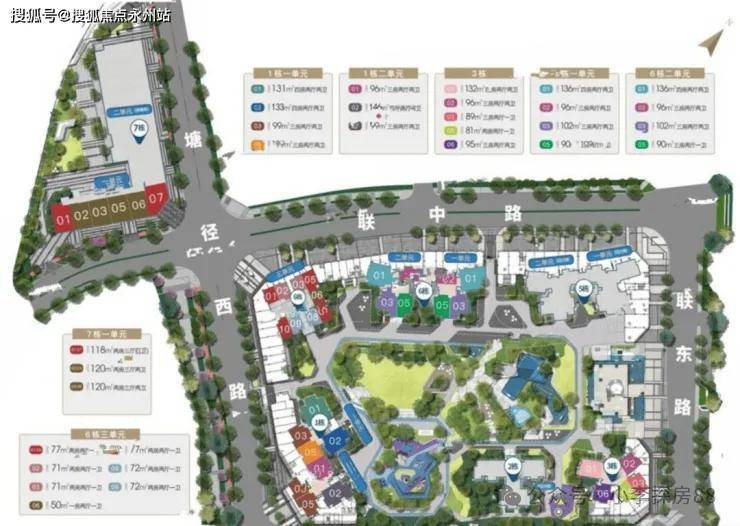主体由7栋建筑构成,7栋为保障房,2栋、3栋(01户型)、5栋、6栋三单元(其中9层)为回迁房,回迁房共595户。