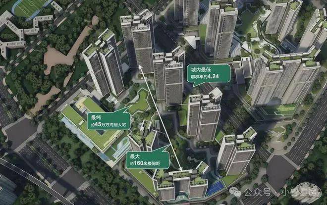 【奢阔楼间宽距】近160米超宽楼间距,最大化楼间距保证了视野的开阔度和充分的通风采光,车位比1:1,区域内最低容积率约4.24,片区稀缺2梯4户/2梯5户/3梯4户/3梯3户,高私密性,高舒适性。