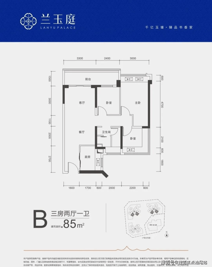 85㎡的3房2厅1卫,B户型,设计的是竖厅格局,客厅开间3.3米,LDKB一体化,三开间朝南,客厅连接次卧出5.7米长的大阳台,L型厨房,创新式三分离卫生间,得房率:79.8%(不含赠送),西南或东南朝向。套内面积67.85㎡+赠送面积11.29㎡=实用79.14㎡,实际得房率93.07%。