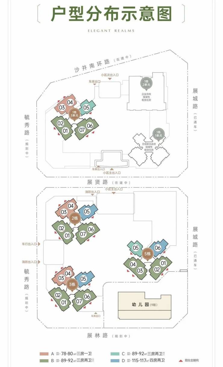 二期分南北两个地块推售,南北地块各3栋楼,其中北地块1栋3个单元楼,只有1栋3单元为住宅商品房(31F-共203套商品房),1栋1单元为政府保障性租赁住房(30F-588套),1栋2单元为企业自持保障性租赁住房(26F-142套),南地块无保障租赁住房(可售商品房601户),有配套建设一所9班制幼儿园,南北地块楼栋之间有展贤路隔开,北地块相对而言没有南地块纯粹。