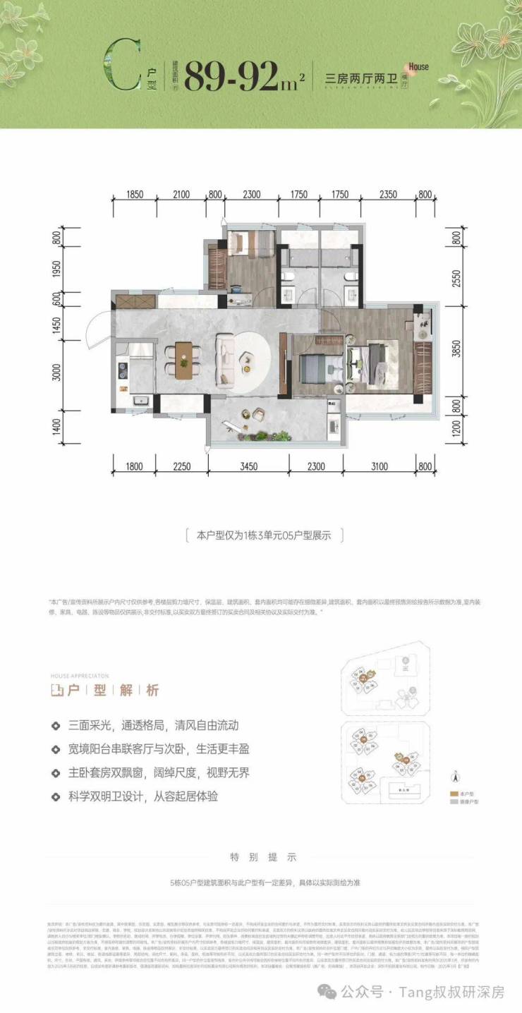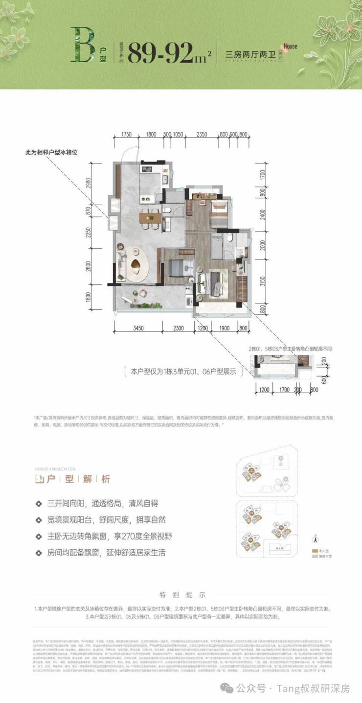 首推售北地块的1栋3单元,户型面积有约78-92㎡的三房(新规后得房率高达96%-105%),备案均价4.76万/㎡,开盘折扣体系约为0.98折(诚意登记0.99*7天准签0.99--要求:七天内准签,含认购当天)。