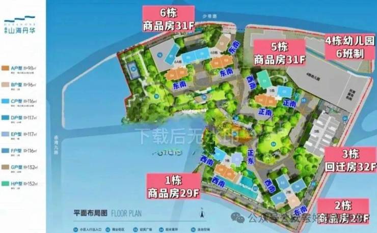 二期即山海丹华府,共由5栋29-32F高的住宅组成,其中1/2栋商品房29F,3栋回迁房32F,5栋/6栋A/B座商品房31F,4栋是1所6班制幼儿园。总规划983套,其中可售商品房412户,全部2梯4户,回迁房571户,集中分布在3栋,另外1/5栋有部分回迁房