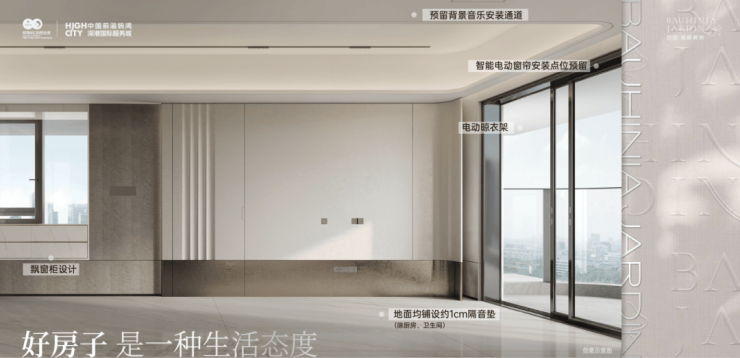 人性化品质精装交付、隐藏式音响接口预留(背景音乐)、预留电动窗帘电源;