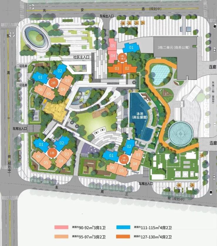 住宅梯户:1栋、2栋、3栋三单元为3梯6户,3栋一单元为3梯5户