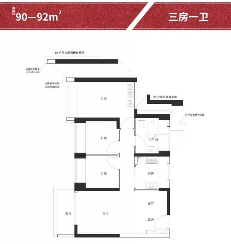1.建筑面积约90-92㎡户型