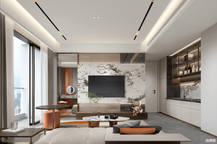 - 约5.1m挑高独立大堂,高端天然石材砌就