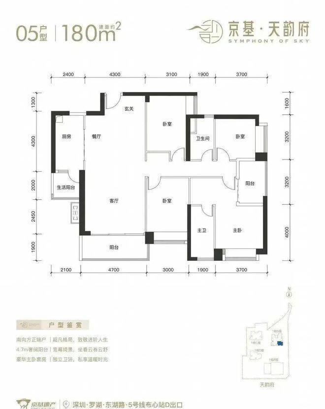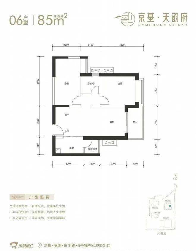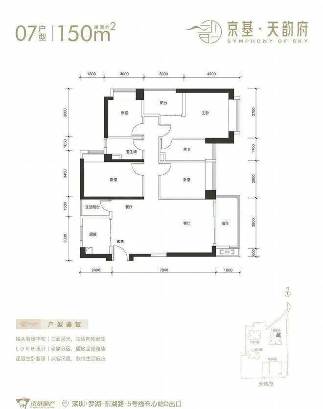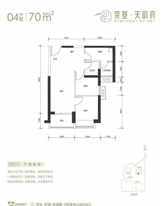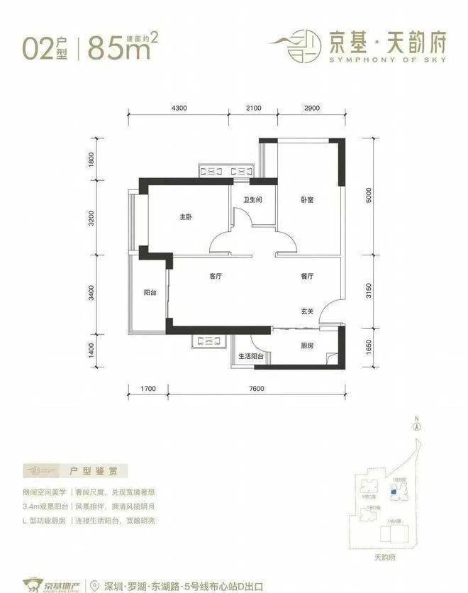 京基天韵府于今年3月23日已开盘!推出1栋B座244套,在售面积有70-85㎡的2房1卫,105㎡的3房2卫,120-150-180㎡的4房2卫户型,备案均价6.56万/㎡,备案单价5.99-7.62万/㎡,总价在453-1387万/套,开盘折扣为备案价85折,开盘当天销售138套,其中项目05-180㎡,06-85㎡及07-150㎡高层景观视野良好可以看到远处的梧桐山以及深圳水库景观,看湖总价最低在400多万。