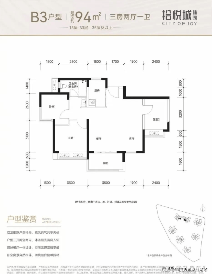 100平三房:设计的是竖厅格局,进门入户玄关,客厅3.4米开间,LDKB一体化设计,3个卧室分别做到了3米/2.9米/2.5米的宽度,U型厨房,公卫三段式分离,得房率:77.14%(不含赠送),阳台1.8米宽度,西南或东南朝向。