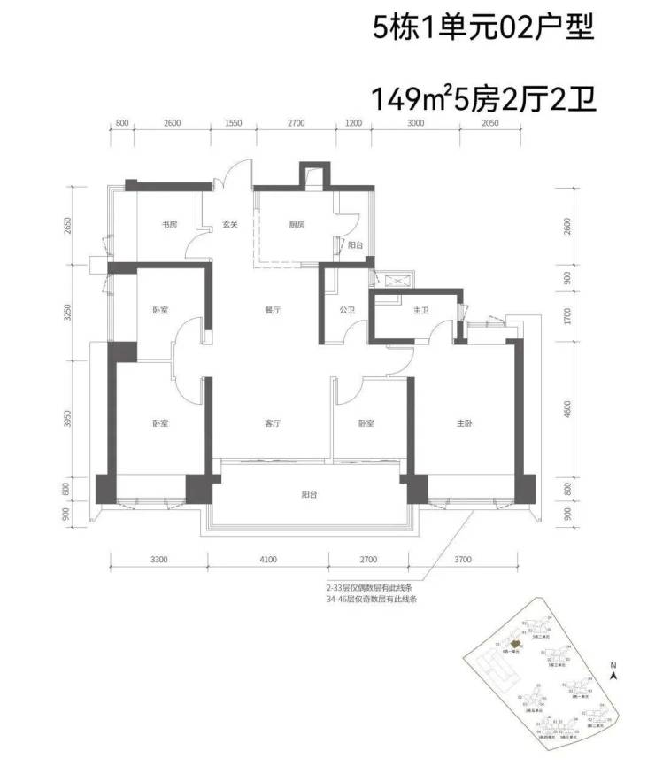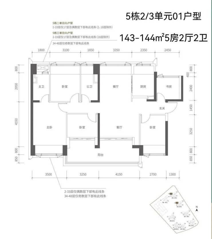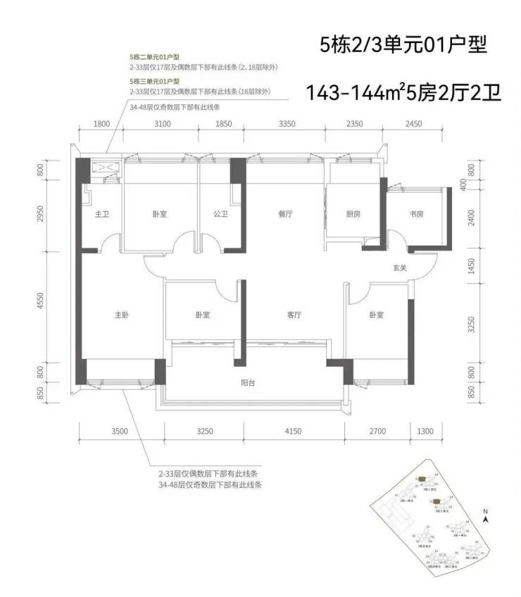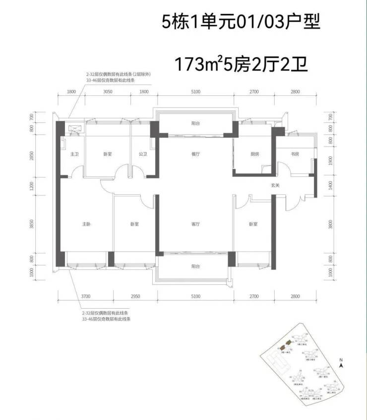 【五栋一单元-平面图】3梯3户,3条腿,分别是01、03号房户型约173㎡的5房2厅2卫、02号房户型约149㎡的5房2厅2卫
