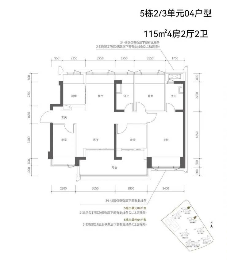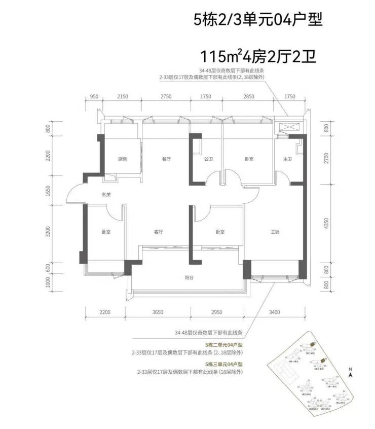 【五栋二单元-平面图】3梯4户,4条腿,01号房户型约144㎡的5房2厅2卫,02、03号房户型约96㎡的3房2厅2卫,04号房户型约115㎡的4房2厅2卫。