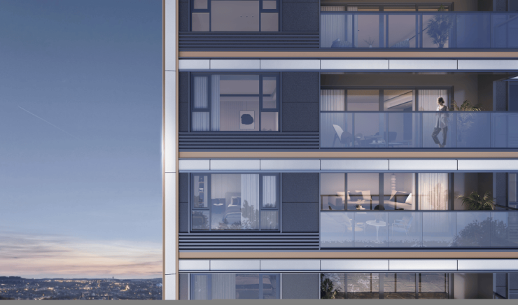 楼盘外立面:建筑外立面,实现千年古韵与现代立面美学结合,材质采用了世界塔尖奢宅标配的铝板和钻感玻璃,珍珠蓝搭配局部驼色点缀。