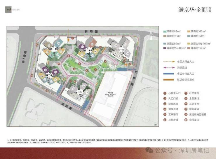 这是一个大体量项目,整体满京华金硕占地约11万㎡,而金硕悦府单独占地约2.61万㎡,建面约21.17万㎡,一共5栋住宅,楼层在32-48层之间,总共1180户。其中1栋1/2单元48层,2栋1单元32层(项目唯一的小高层,2梯6户),2栋2单元47层,3栋48层,4栋是幼儿园。项目还配建了社区菜市场,地下室有3层。