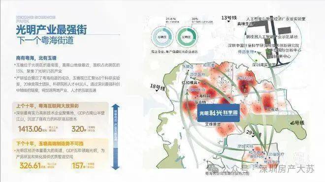玉塘位于光明区的最南面,离南山地缘最近,面积占光明区的13%,聚集了光明1/3的产业产研结合奠定了粤海街道的成功,玉塘现已汇聚168个科研实验室,20余支院士团队,科研院所人才4400人。通过深圳最强科创中轴线的链接,将加速两地产业、人才的互联互通。