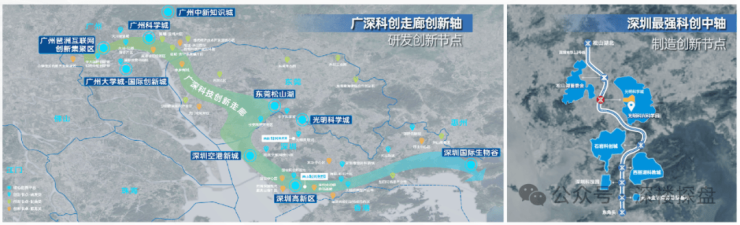 🏙双轴:广深科创走廊创新轴-研发创新节点和深圳最强科创中轴-制造创新节点,东起深圳国际生物谷,西至广州琶洲互联网创新集聚区、南联深圳科技园和后海商务区,北接松山湖,肩负共筑“创新脊梁”的重要使命