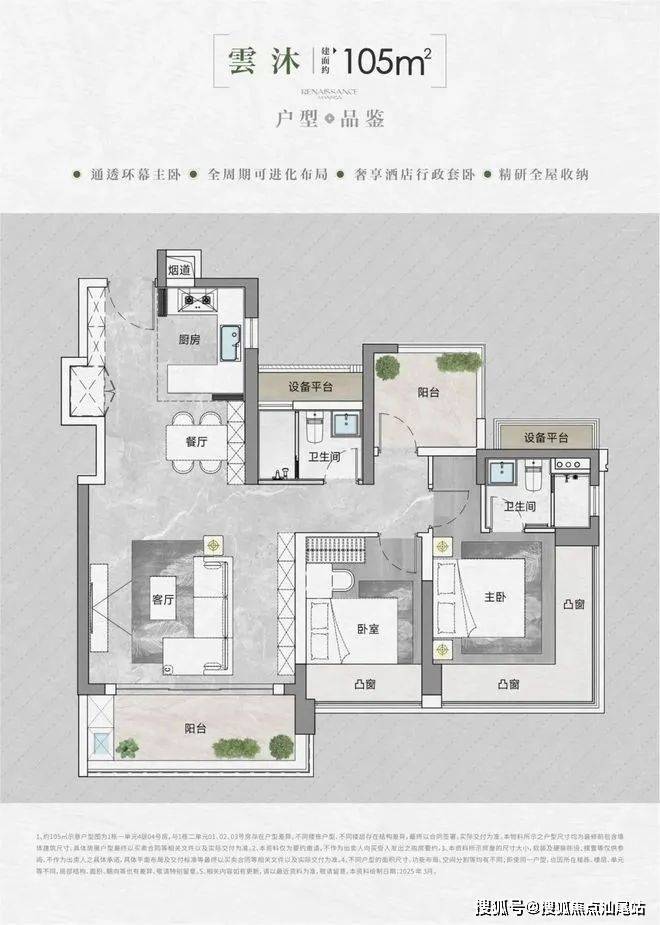 105㎡三房两卫:实用性三房,可改四房,功能齐全,性价比较高。