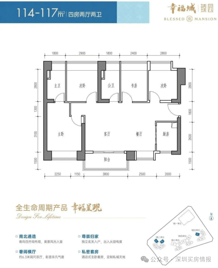 二单元:56F 4梯6户 96-117㎡3-4房;