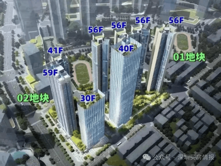01-02地块占地约1.23万平方米,总建筑面积约15.08万平方米,计容建筑面积约10.85万平方米,容积率为8.31,绿化率为40.01%。该地块包含2栋住宅楼,分别为41层和59层,以及1栋30层的办公楼和1所9班制幼儿园。总规划1194户,住宅楼采用3梯4户设计,其中包括972套保障房。