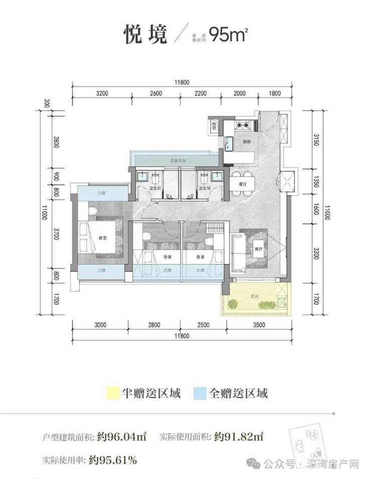 而95平表面看起来3房2卫的户型,使用率含赠送约95.61%,同样是传统竖厅格局,但是赠送的设备平台连接2个卫生间,所以就有网友开始爆改!
