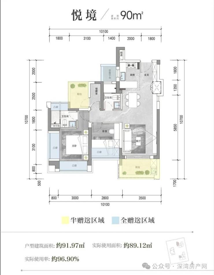 首先看看90㎡的3房两卫,使用率含赠送约96.9%,传统竖厅格局,有个次卧需要阳台改房间,主卧双面飘窗采光,其中一面可以用来做衣柜。