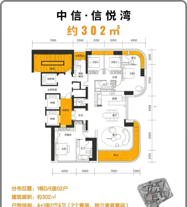 302㎡(D/E栋户型): 四房两厅四卫+保姆间,是整个项目的“主力担当”。值得注意的是,20层以上的楼层因可越过歌剧院看无遮挡海景,价格有显著跃升。同时,同一楼层中,视野更佳的02户型会比01户型贵出约300万。这生动诠释了,在顶豪世界里,每一寸视野都明码标价。