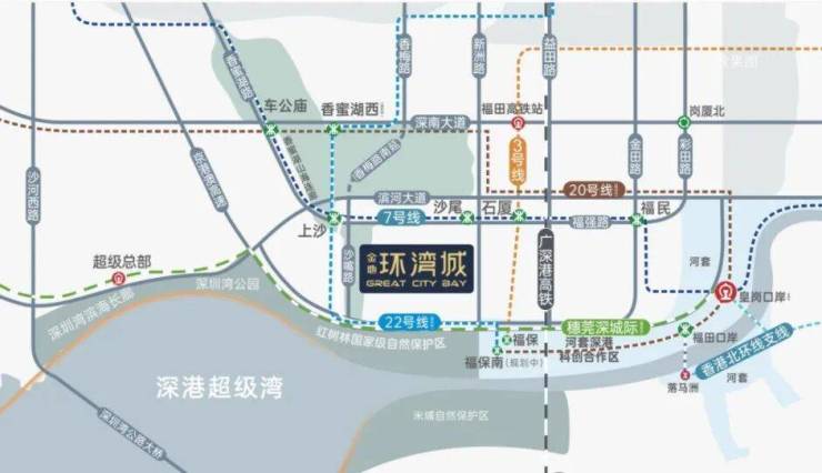 交通网络升级:项目坐拥双地铁(7号线已开通、22号线在建)、双口岸(福田/皇岗)及双城际(穗莞深城际等)的立体交通体系。特别是皇岗口岸改造后将成为3条城际轨道与2条地铁的交汇枢纽,未来乘坐22号线1站可直达。