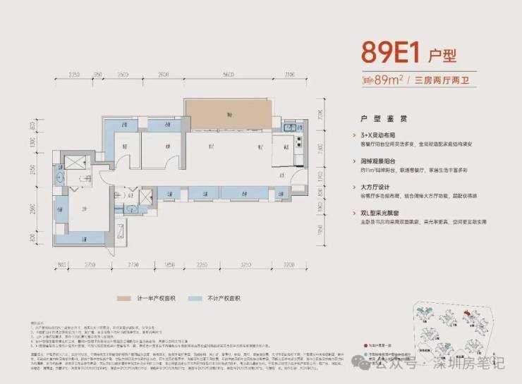 89㎡3房:268-302万,单价2.98-3.39万/㎡