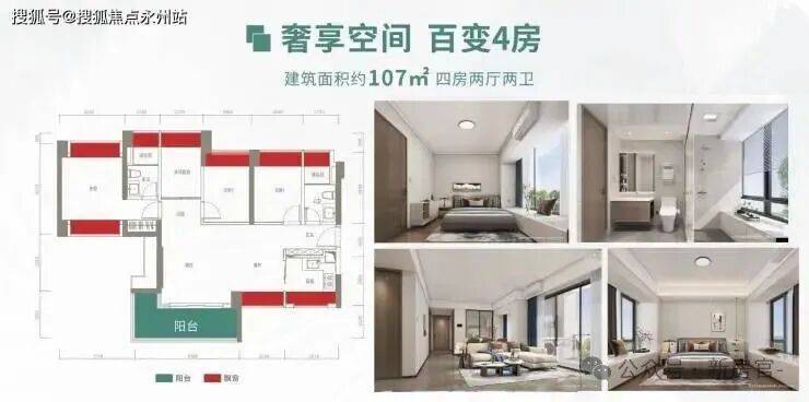 107㎡四房两卫(1栋1/2/3单元01/06户型)竖厅南北通透格局,餐客一体,动静分区结构,L型阳台,3房+1多功能房,户型使用率高,但进门即是公卫,有点不太好,01户型东南朝向,06户型西南朝向
