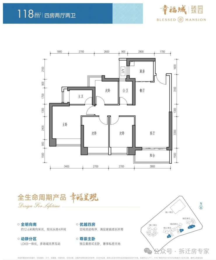 114-117㎡:4房2卫横厅南北通透,客餐厅6.3米开间,全屋8个飘窗,主卧15.35㎡。