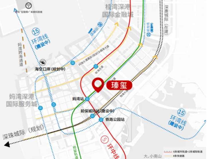 瑧玺周边共规划6条地铁线、2条城际轨道、1条妈湾跨海隧道及1个海空口岸。
