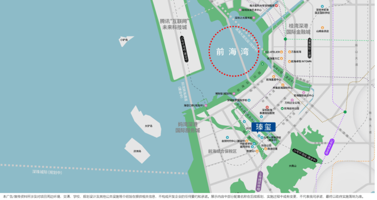 前海瑧玺位于前海妈湾片区,是妈湾2.9平方公里理想城市重点标杆项目之一。妈湾在前海核心三区中特点最为明显,占地面积最大,容积率最小不足 2,两面环海、连山聚湾,与周边大小南山、大铲岛科技岛等形成巧妙的互望空间,是前海唯一背山面海的风水圣地。
