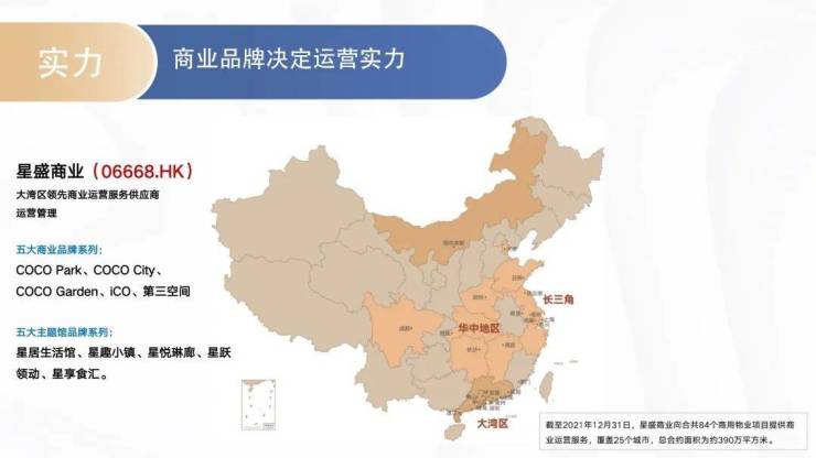 大湾区领先商业运营服务供应商上市企业(06668.HK)星盛商业,运营管理五大商业品牌系列:COCO Park、COCO City、COCO Garden、iCO、第三空间,五大主题馆品牌系列:星居生活馆、星趣小镇、星悦琳廊、星跃领动、星享食汇。