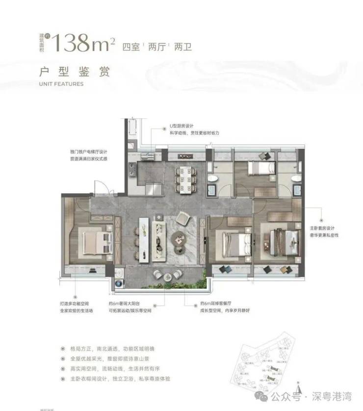入户玄关巧妙隔绝视线,隐私感拉满。客餐厅南北通透,大客厅除传统布局外,还增设茶台区域,两者共享 6 米多宽景阳台,搭配 U 型厨房与方正餐厅,公区气场全开。