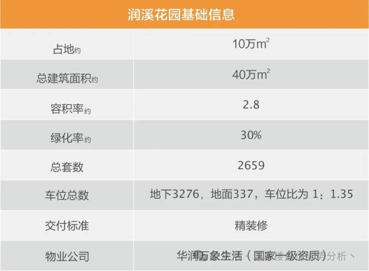 润溪花园是华润置地在大亚湾第一个楼盘,项目占地面积约为十万平米,总建筑面积约为四十万平米,容积率二点八,绿化率百分之三十,总套数两千六百五十九套,带精装修交付,物业公司为华润自己的物业,华润万象生活,国家一级资质,华润的物业全国知名