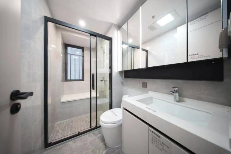 卫生间,还参考星级酒店做法,通过多功能镜柜,分层收纳;马桶侧预留收纳柜,方便起居使用。
